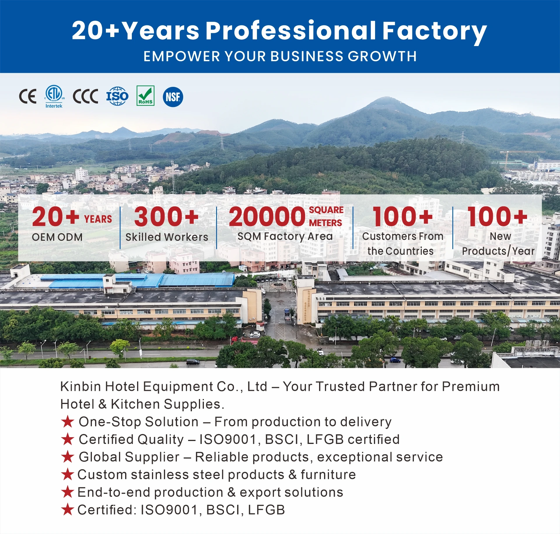 Kinway Hotel Equipment Co., Ltd is a professional kitchen ware source factory. The company’s founders and management team have 20 years of industry experience and export experience.The company's products cover hotel supplies, stainless steel products, hotel and kitchen furniture,and other business operations, is a set of production, sales, customization and other functions in a comprehensive hotel supplies company. With complete facilities, thoughtful service is the preferred,supplier of Catering equipment supplies procurement, The enterprise implements customer-oriented,quality management assurance system, and has passed ISO9001,CE,NSF, BSCl and LFGB certifications .